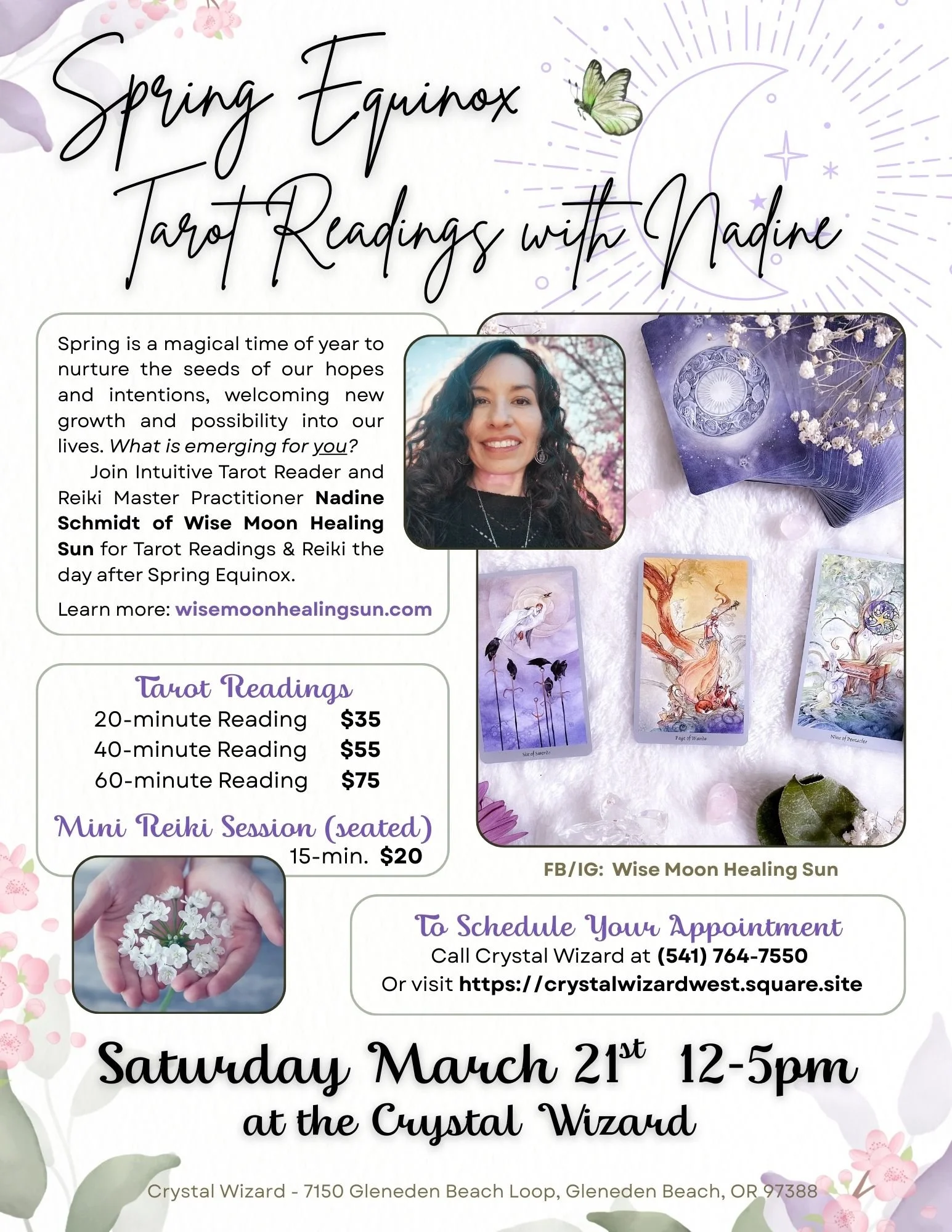 Join me once for Springtime Readings & Reiki at the Crystal Wizard in Gleneden Beach, Oregon! I’m so excited to bring my tarot services to their beautiful, magical shop once again. I will be offering readings as well as mini Reiki sessions, which can each be enjoyed on their own, or as a combo session for an extra healing & integrative experience.