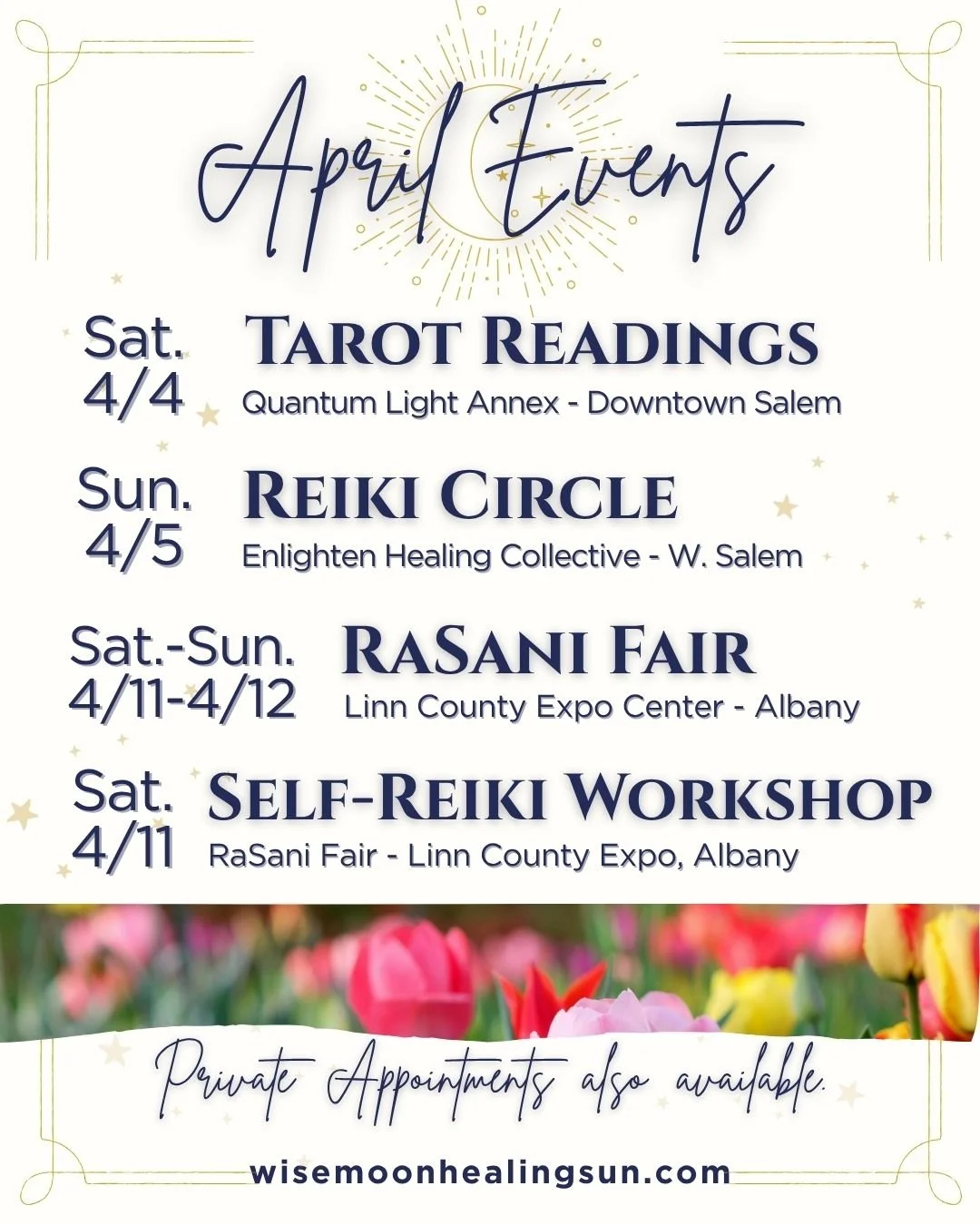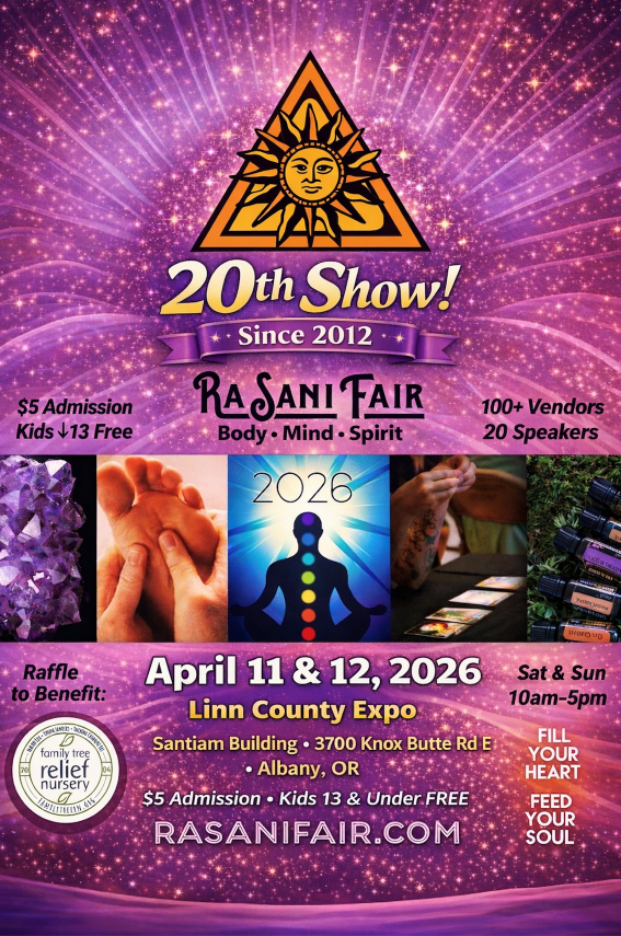 Join me at RaSani Fair—the Willamette Valley’s premier Body-Mind-Spirit holistic fair—April 11th & 12th 10am-5pm! I’ll be there with over 100 vendors for a magical weekend of holistic healing, metaphysical gifts, educational learning opportunities, and more. Find me at Booth#59 (new location) where I’ll be offering tarot readings and mini Reiki sessions!!